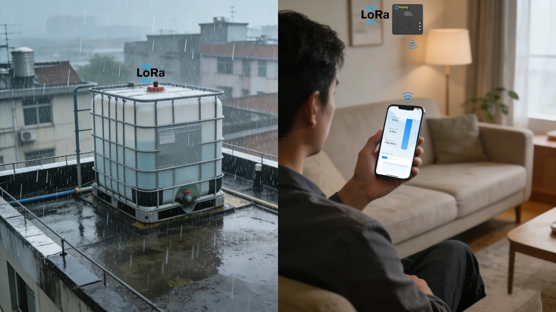 Die ultrasoniese sensor (aangedryf deur 'n massiewe 9000mAh herlaaibare battery) monteer bo jou tenk en stuur vlakdata draadloos via LoRa – tot 1-2 km in oop ruimte.