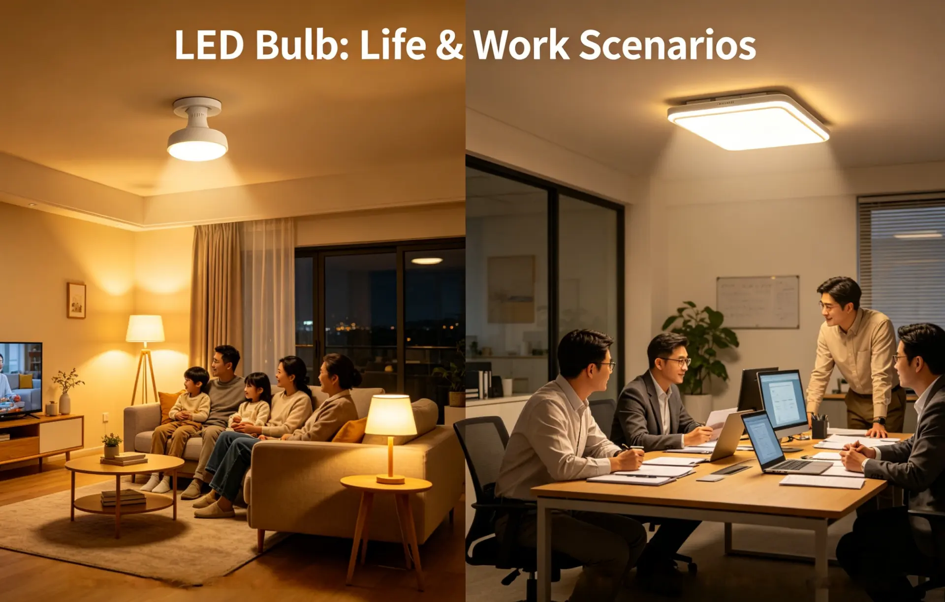홈 조명: 거실에 적합함, 침실, 등. 따뜻한 빛 (3000K) 위로를 위해서야, 시원한 빛 (6500K) 독서/요리용으로, 다양한 용도에 맞게 조광 가능.