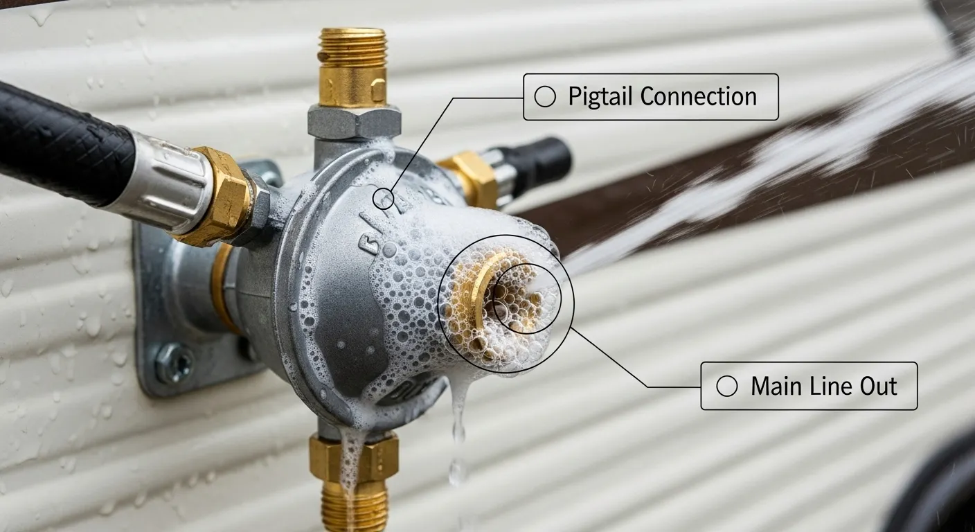 You should perform a full "soapy water test" on all connections at the beginning of every camping season, and any time you disconnect and reconnect a tank. It's also wise to do a quick check after driving on particularly rough roads, as vibrations can loosen fittings.