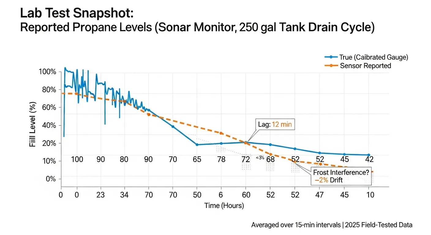 Each site ran for 90 days, with weekly manual gauge checks for comparison. We logged environmental factors (humidity, frost, nearby metal structures) that might mess with sonar accuracy.
