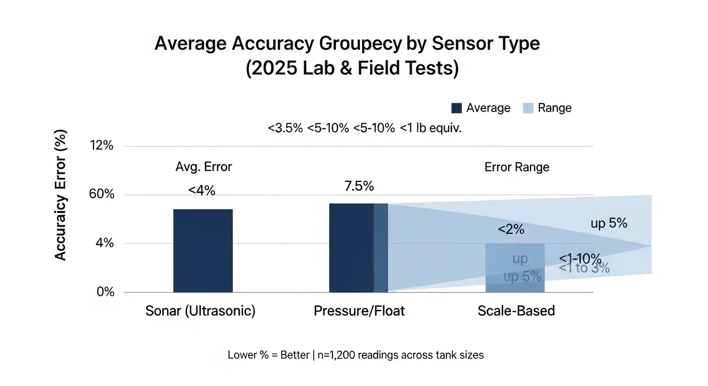 Expect ±3–6% depending on type and conditions. Sonar sensors are the most consistent, especially after cleaning and calibration. Pressure-style monitors are steady but slower to update.